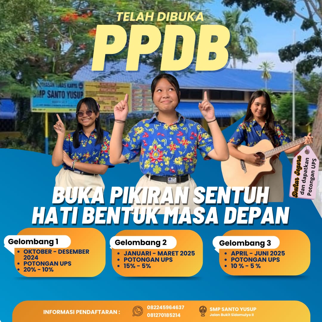 Maka dari itu, mari bergabung dengan kami menjadi keluarga besar SMP Santo Yusup dan dapatkan potongan-potongan UPS, dll-nya.